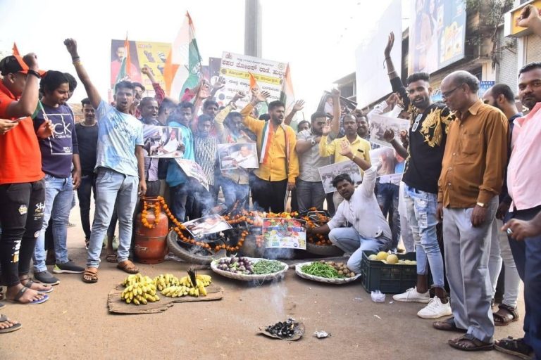 ಹುಬ್ಬಳ್ಳಿ: ಕೇಂದ್ರ ಸರ್ಕಾರ ತೈಲ ಬೆಲೆ ಏರಿಕೆ ಮಾಡಿದ್ದನ್ನು ಖಂಡಿಸಿ, ಕಾಂಗ್ರೆಸ್ ಕಾರ್ಯಕರ್ತರಿಂದ ನಗರದ ದುರ್ಗದ ಬೈಲ್ ದಲ್ಲಿ ಸಿಲಿಂಡರ್, ಬಾಳೆ ಹಣ್ಣು, ಬೈಕ್ ಅಣುಕು ಶವ...