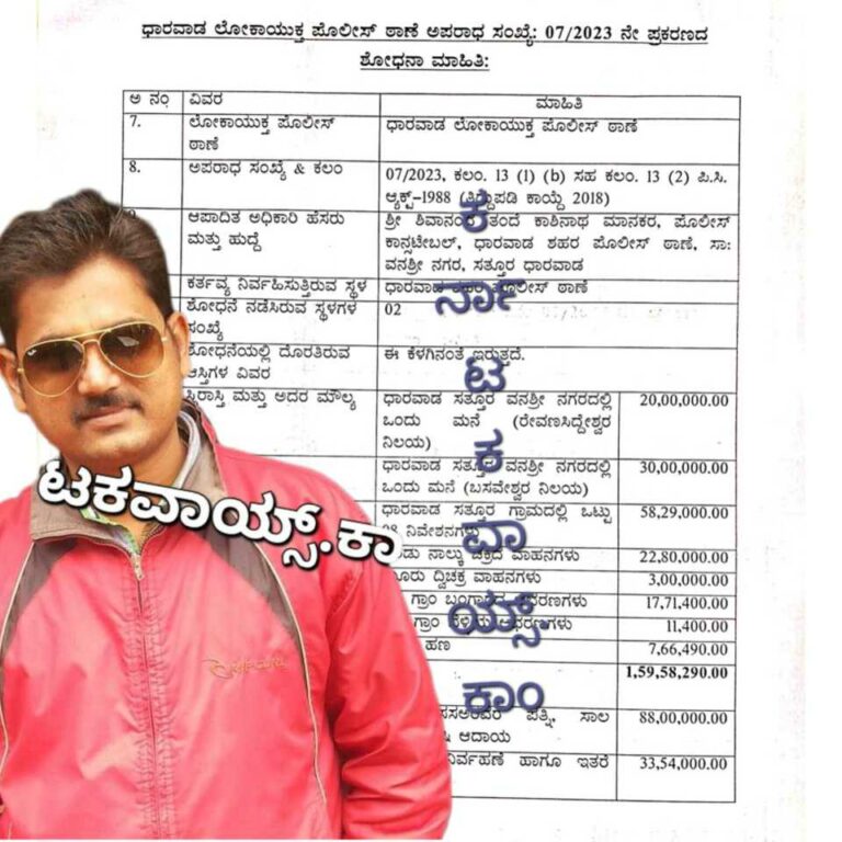 ಧಾರವಾಡ: ಸತ್ತೂರ ಮೂಲದ ಧಾರವಾಡ ಶಹರ ಠಾಣೆಯ ಪೊಲೀಸ್ ಶಿವಾನಂದ ಮಾನಕರ ಎಷ್ಟೊಂದು ಅಕ್ರಮ ಆಸ್ತಿ ಗಳಿಸಿದ್ದಾನೆಂಬ ಮಾಹಿತಿಯನ್ನ ಅಧಿಕೃತವಾಗಿ ಲೋಕಾಯುಕ್ತ ಪೊಲೀಸರು ಬಹಿರಂಗ ಮಾಡಿದ್ದು, ಓರ್ವ...