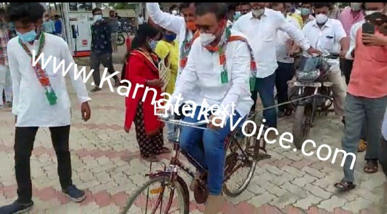 ಕಲಘಟಗಿ: ತೈಲ ಬೆಲೆ ಏರಿಕೆಯನ್ನ ಖಂಡಿಸಿ ಪಟ್ಟಣದಲ್ಲಿ ನಡೆದ ಪ್ರತಿಭಟನೆಯಲ್ಲಿ ಮಾಜಿ ಸಚಿವ ಸಂತೋಷ ಲಾಡ ವಿನೂತನವಾಗಿ ಪ್ರತಿಭಟನೆ ನಡೆಸಿದ್ದು, ಸೈಕಲ್ ಗೆ ಬೈಕ್ ಕಟ್ಟಿ ಸೈಕಲ್...