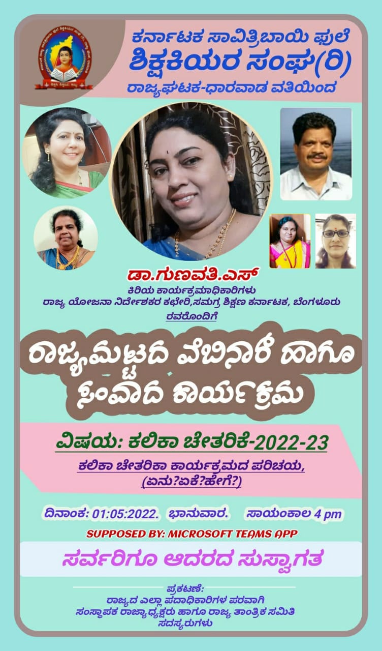 ದಿನಾಂಕ.01.05.2022. ರವಿವಾರ ಸಂಜೆ. 4.00 ಗಂಟೆಗೆ ರಾಜ್ಯ ಮಟ್ಟದ ವೆಬಿನಾರ್ (Suported By micro Soft Teams app) ????????????????????????????????ಕರ್ನಾಟಕ ಸಾವಿತ್ರಿಬಾಯಿ ಫುಲೆ ಶಿಕ್ಷಕಿಯರ ಸಂಘ(ರಿ) ರಾಜ್ಯ...