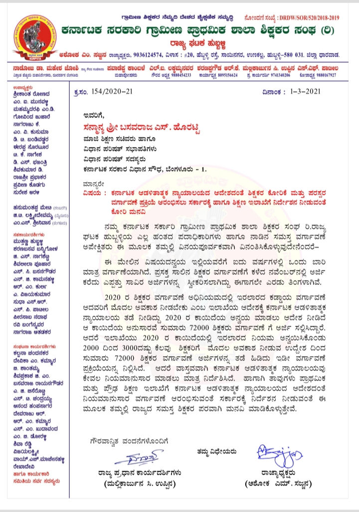 2020 ರ ಶಿಕ್ಷಕರ ವರ್ಗಾವಣೆ ಅಧಿನಿಯಮದಲ್ಲಿ ಇರಲಾರದ ಕಡ್ಡಾಯ ವರ್ಗಾವಣೆ ಆದವರಿಗೆ ಮೊದಲ ಅವಕಾಶ ನೀಡಬೇಕು ಎಂಬ ಇಲಾಖೆಯ ಆದೇಶಕ್ಕೆ ಕರ್ನಾಟಕ ಆಡಳಿತಾತ್ಮಕ ನ್ಯಾಯಾಲಯ ತಡೆ ನೀಡಿದ್ದು 2020 ರ ಕಾಯಿದೆಯ ಅನ್ವಯ ಮಾಡಲು ಆದೇಶ ನೀಡಿದೆ ಆ ಕಾಯಿದೆಯ ಅನುಸಾರವೆ ಸುಮಾರು 72000 ಶಿಕ್ಷಕರು ವರ್ಗಾವಣೆ ಗೆ ಅರ್ಜಿ ಸಲ್ಲಿಸಿದ್ದಾರೆ ..ಆದರೆ ಇಲಾಖೆಯು 2020 ರ ಕಾಯಿದೆಯಲ್ಲಿ ಇರಲಾರದ ನಿಯಮ ಅನ್ವಯಿಸಿಕೊಂಡು 2000 ದಿಂದ 3000ದಷ್ಟು ಕೆಲವು ಶಿಕ್ಷಕರಿಗೆ ಮೊದಲ ಅವಕಾಶ ನೀಡುವ ಉದ್ದೇಶದಿಂದ ಸುಮಾರು 72000 ಶಿಕ್ಷಕರ ವರ್ಗಾವಣೆ ಅರ್ಜಿಗಳನ್ನ ತಡೆ ಹಿಡಿದು ಇಡೀ ವರ್ಗಾವಣೆ ಪ್ರಕ್ರಿಯೆಯನ್ನ ನಿಲ್ಲಿಸಿದೆ ಆದರೆ ವಾಸ್ತವವಾಗಿ ಕರ್ನಾಟಕ ಆಡಳಿತಾತ್ಮಕ ನ್ಯಾಯಾಲಯವು ಕೇವಲ ನಿಯಮಾನುಸಾರ ಮಾಡಲು ಮಾತ್ರ ನಿರ್ದೆಶಿಸಿದೆ …ಹಾಗಾಗಿ ತಾವುಗಳು ಪ್ರಾಥಮಿಕ ಮತ್ತು ಪ್ರೌಢ ಶಿಕ್ಷಣ ಇಲಾಖೆಗೆ ಕರ್ನಾಟಕ ಆಡಳಿತಾತ್ಮಕ ನ್ಯಾಯಾಲಯದ ಆದೇಶದಂತೆ ನಿಯಮಾನುಸಾರ ವರ್ಗಾವಣೆ ಆರಂಭಿಸುವಂತೆ ಸರ್ಕಾರಕ್ಕೆ ನಿರ್ದೆಶನ ನೀಡುವಂತೆ ಈ ಮೂಲಕ ತಮ್ಮಲ್ಲಿ ರಾಜ್ಯದ ಸಮಸ್ತ ಶಿಕ್ಷಕರ ಪರವಾಗಿ ಮನವಿ ಮಾಡಿಕೊಳ್ಳುತ್ತೇವೆ.