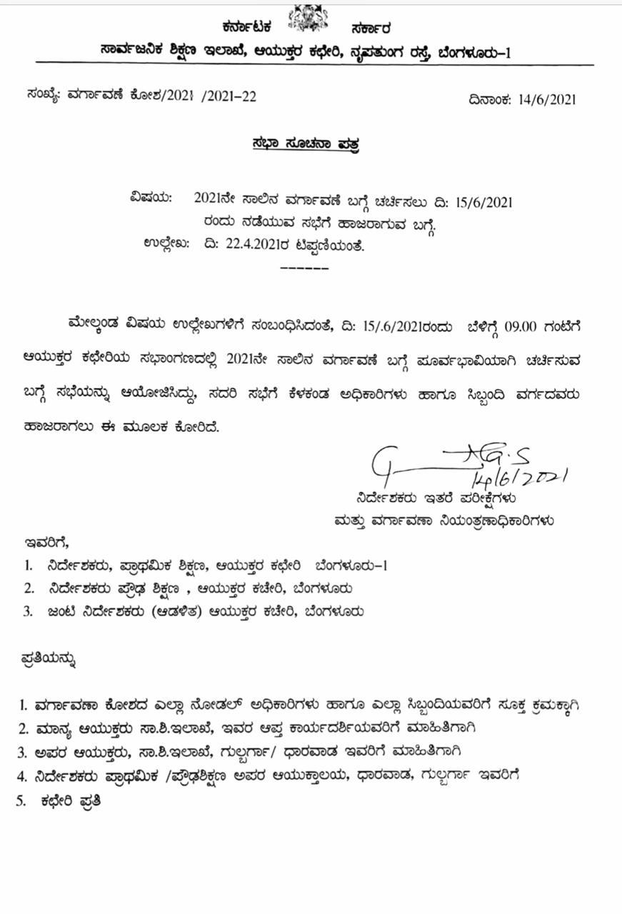 2021ನೇ ಸಾಲಿನ ವರ್ಗಾವಣೆ ಬಗ್ಗೆ ಚರ್ಚೆ ನಡೆಸಲು ನಿರ್ದೇಶಕರು ಸೂಚನಾ ಪತ್ರವನ್ನ ಹೊರಿಡಿದ್ದು, ಸಭೆಯಲ್ಲಿ ಇಲಾಖೆಯ ಮಹತ್ವದ ನಿರ್ಣಯವನ್ನ ತೆಗೆದುಕೊಳ್ಳುವ ಸಾಧ್ಯತೆಯಿದೆ.