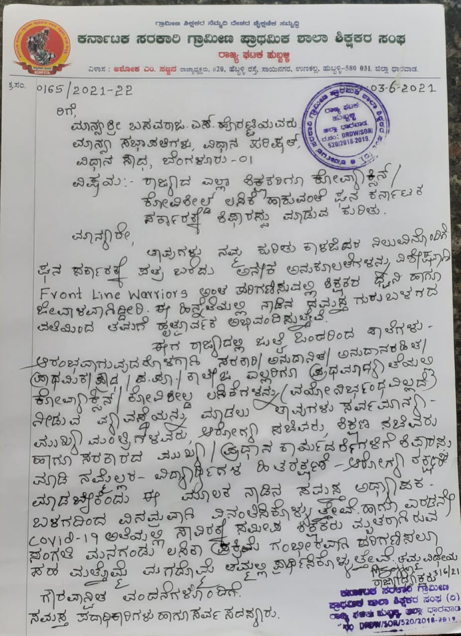 ಈಗ ರಾಜ್ಯದಲ್ಲಿ ಜುಲೈ ಒಂದರಿಂದ ಶಾಲೆಗಳು ಆರಂಭ ಆಗುವುದರೊಳಗಾಗಿ ಸರಕಾರಿ/ ಅನುದಾನಿತ/ ಅನುದಾನರಹಿತ ಪ್ರಾಥಮಿಕ /ಪ್ರೌಢ/ ಪದವಿಪೂರ್ವ/ ಕಾಲೇಜು ಎಲ್ಲರಿಗೂ ಪ್ರಥಮ ಆದ್ಯತೆಯಲ್ಲಿ ಕೋವ್ಯಾಕ್ಸಿನ್ ಕೊವಿಶೀಲ್ಡ್ ಲಸಿಕೆಗಳನ್ನು ವಯೋ ನಿರ್ಬಂಧ ಇಲ್ಲದೆ ನೀಡುವ ವ್ಯವಸ್ಥೆಯನ್ನು ಮಾಡಲು ತಾವುಗಳು ಸರ್ವ ಮಾನ್ಯ ಮುಖ್ಯಮಂತ್ರಿಗಳವರು ,ಆರೋಗ್ಯ ಸಚಿವರು ಶಿಕ್ಷಣ ಸಚಿವರು ಹಾಗೂ ಸರ್ಕಾರದ ಮುಖ್ಯ /ಪ್ರಧಾನ ಕಾರ್ಯದರ್ಶಿಗಳಿಗೆ ಶಿಫಾರಸು ಮಾಡಿ ನಮ್ಮೆಲ್ಲರ ,ವಿದ್ಯಾರ್ಥಿಗಳ ಹಿತರಕ್ಷಣೆ ,ಆರೋಗ್ಯ ರಕ್ಷಣೆ ಮಾಡಬೇಕೆಂದು ಈ ಮೂಲಕ ನಾಡಿನ ಸಮಸ್ತ ಅಧ್ಯಾಪಕ ಬಳಗದಿಂದ ವಿನಮ್ರವಾಗಿ ವಿನಂತಿಸಿಕೊಳ್ಳುತ್ತೇವೆ