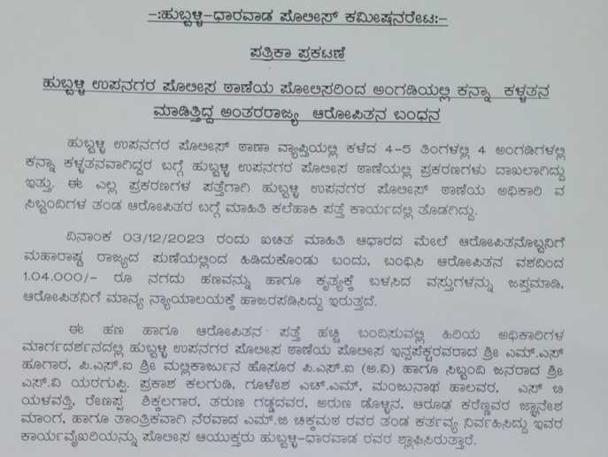 ಹುಬ್ಬಳ್ಳಿಯಲ್ಲಿ ಕಳ್ಳತನ ಮಾಡಿದ್ದ ಕಳ್ಳನನ್ನ “ಮಹಾರಾಷ್ಟ್ರ”ದಲ್ಲಿ ಬಂಧಿಸಿದ ಪೊಲೀಸರು…