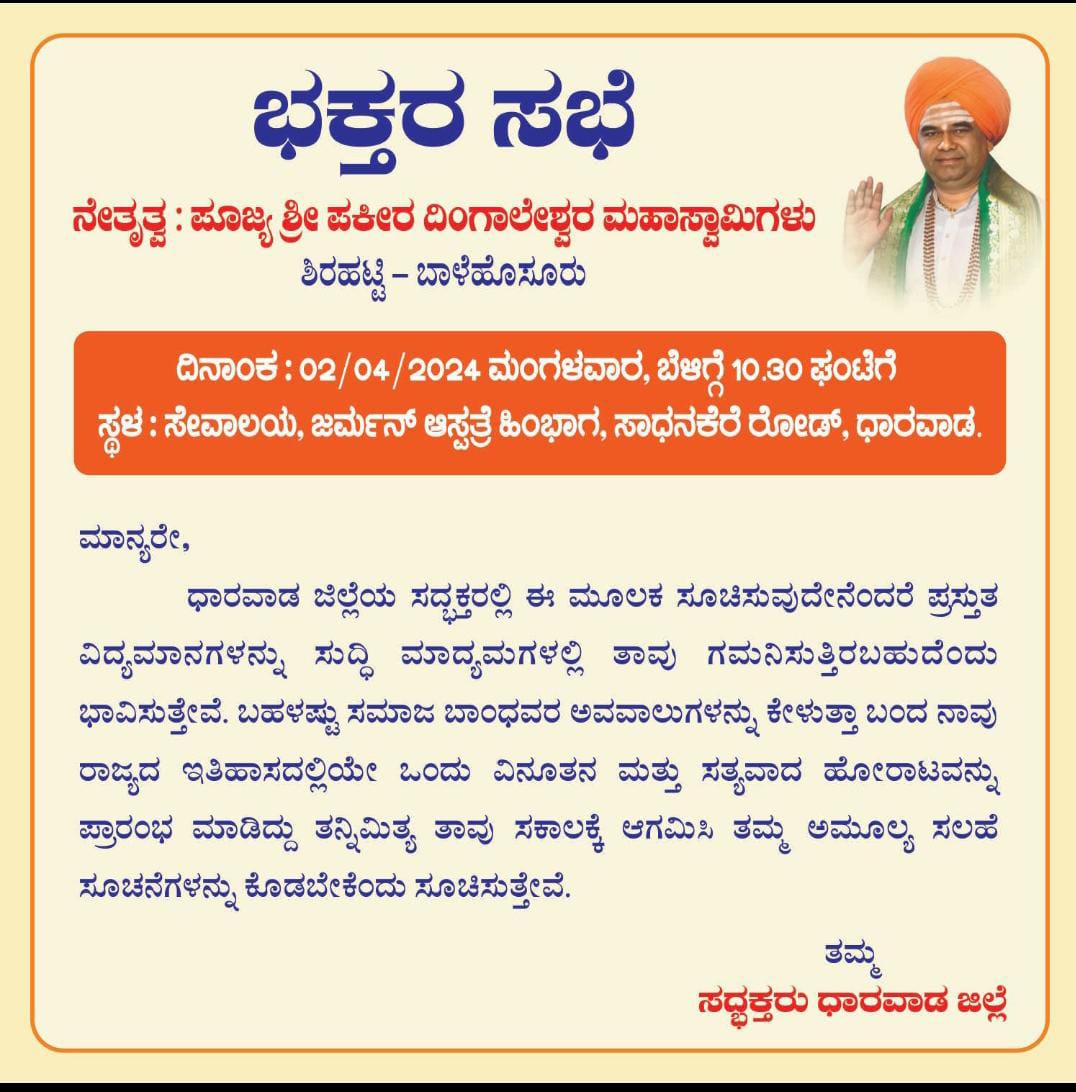 ನಾಳೆ ಶ್ರೀ ಫಕೀರ ದಿಂಗಾಲೇಶ್ವರ “ಭಕ್ತರ ಸಭೆ”- ಚುನಾವಣೆ ಸ್ಪರ್ಧೆ 100% ಸತ್ಯವಲ್ಲ….!!!!