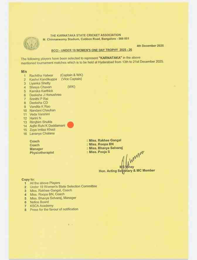 ಇದಕ್ಕೂ ಮುನ್ನ ಕೆಎಸ್ಸಿಎ ಆಯೋಜಿಸುವ ಮಹಾರಾಣಿ ಟ್ರೋಫಿಯಲ್ಲಿ ಮಹಾರಾಜ ವಾರಿಯರ್ಸ್ ತಂಡಕ್ಕೆ ಆಯ್ಕೆಯಾಗಿದ್ದ ರೂಹಿ ಗಮನಾರ್ಹ ಸಾಧನೆ ಮಾಡಿದ್ದಳು.