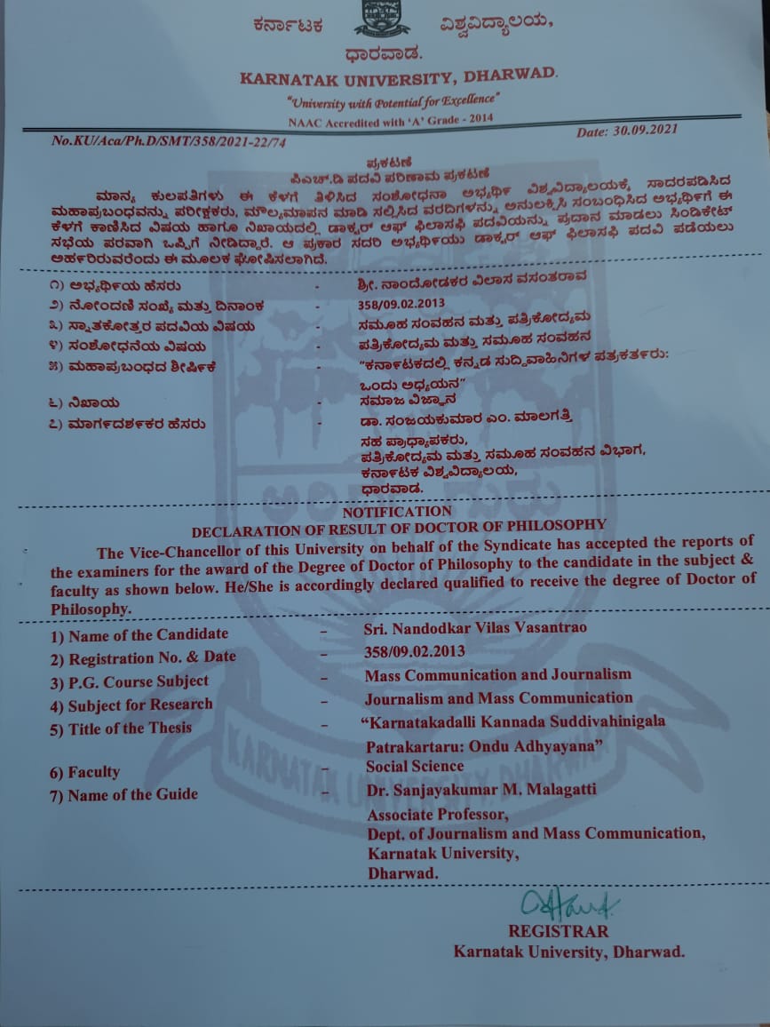 ಧಾರವಾಡ: ವಿದ್ಯುನ್ಮಾನ ಮಾಧ್ಯಮದ ಪತ್ರಕರ್ತ ವಿಲಾಸ ವಸಂತರಾವ್ ನಾಂದೋಡಕರ ಅವರು ಸಾದರಪಡಿಸಿದ “ಕರ್ನಾಟಕದಲ್ಲಿ ಸುದ್ದಿವಾಹಿನಿಗಳ ಪತ್ರಕರ್ತರು : ಒಂದು ಅಧ್ಯಯನ” ಕುರಿತ ಪ್ರೌಢ ಪ್ರಬಂಧಕ್ಕೆ ಕರ್ನಾಟಕ ವಿಶ್ವವಿದ್ಯಾಲಯ ಡಾಕ್ಟರೇಟ್ ಪದವಿ ನೀಡಿ ಗೌರವಿಸಿದೆ.