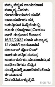 ಮಾಜಿ ಸಚಿವ ವಿನಯ ಕುಲಕರ್ಣಿ ನಿವಾಸಕ್ಕೆ ಅನಾಮಧೇಯ ಪತ್ರ….!!!