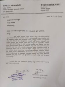 ಹುಬ್ಬಳ್ಳಿ: ಮಾಜಿ ಸಚಿವ ವಿನಯ ಕುಲಕರ್ಣಿಯವರ ಧಾರವಾಡದ ಬಾರಾಕೊಟ್ರಿಯಲ್ಲಿರುವ ನಿವಾಸಕ್ಕೆ ಅನಾಮಧೇಯ ಪತ್ರಗಳು ಬರುತ್ತಿರುವ ಬಗ್ಗೆ ಕಠಿಣ ಕ್ರಮ ಜರುಗಿಸುವಂತೆ ವಿಕೆಯವರ ಪತ್ನಿ ಶಿವಲೀಲಾ ಕುಲಕರ್ಣಿಯವರು ಪೊಲೀಸ್ ಕಮೀಷನರ್ ಅವರಿಗೆ ದೂರು ನೀಡಿದರು.