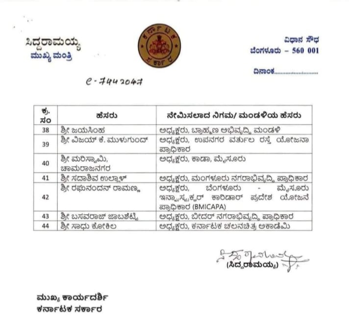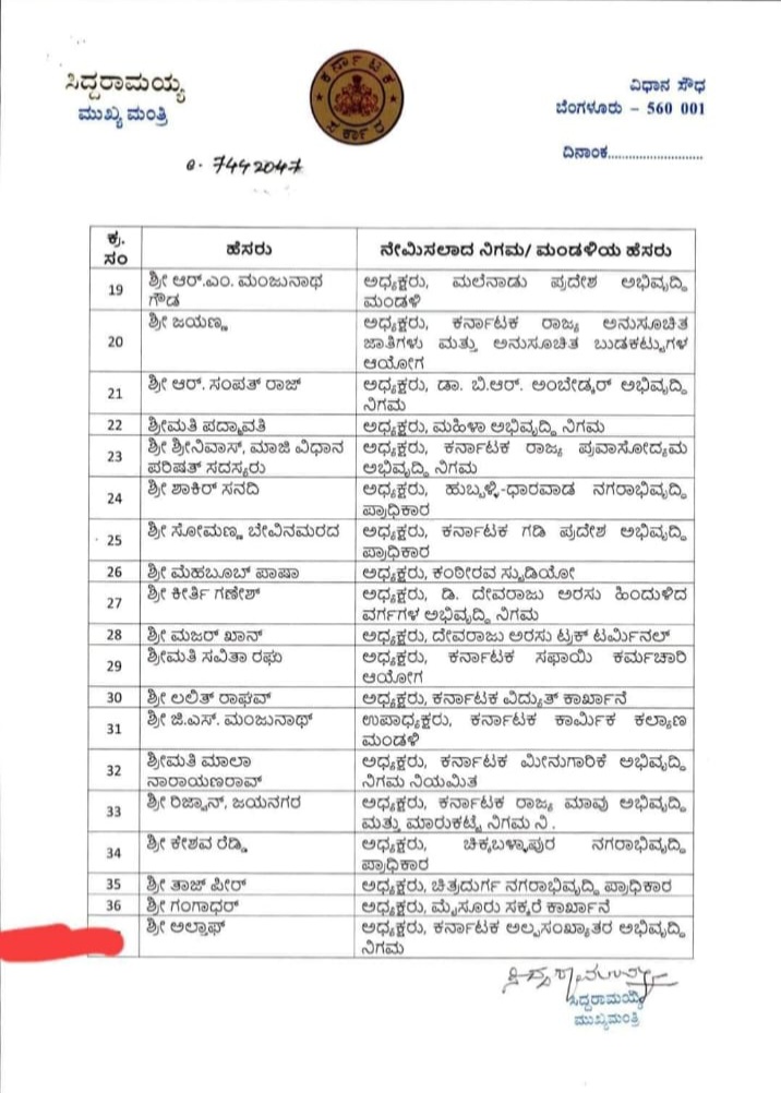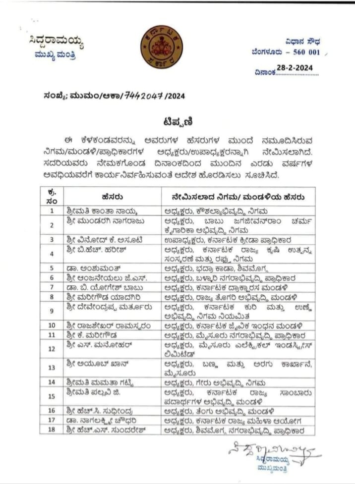 ಬೆಂಗಳೂರು: ಕಾಂಗ್ರೆಸ್ ಪಾಳಯದಲ್ಲಿ ಹಲವು ದಿನಗಳಿಂದ ನೆನೆಗುದಿಗೆ ಬಿದ್ದಿದ್ದ ನಿಗಮ ಮಂಡಳಿಗಳ ನೇಮಕ ಮಾಡಿ ಸರಕಾರ ಆದೇಶ ಹೊರಡಿಸಿದೆ.