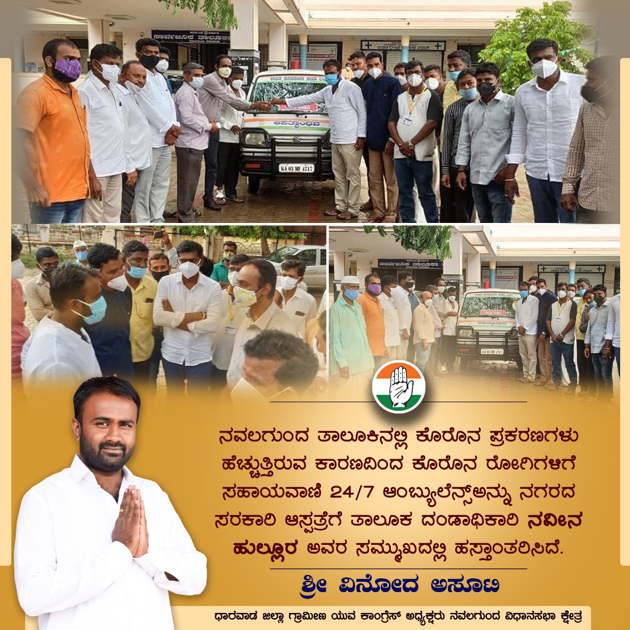 ಜನರಿಗಾಗಿ ಸದಾಕಾಲ ಒಂದಿಲ್ಲಾ ಒಂದು ರೀತಿಯಲ್ಲಿ ಸಹಾಯ ಮಾಡುತ್ತಲೇ ಇರುವ ವಿನೋದ ಅಸೂಟಿಯವರು, ಅಂಬ್ಯುಲೆನ್ಸನ್ನ ತಹಶೀಲ್ದಾರ ನವೀನ ಹುಲ್ಲೂರ ಮೂಲಕ ಆಸ್ಪತ್ರೆಗೆ ಹಸ್ತಾಂತರಿಸಿದರು.