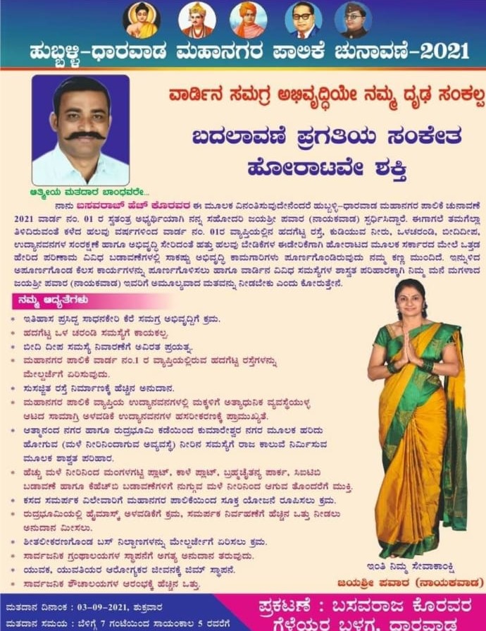ಧಾರವಾಡ: ಹಲವು ಪ್ರಮುಖ ಬಡಾವಣೆಗಳನ್ನು ಹೊಂದಿರುವ ವಾರ್ಡ್ ನಂಬರ್ ರಲ್ಲಿ  ಜಯಶ್ರೀ ಪವಾರ (ನಾಯಕವಾಡ) ಅವರು ಪಕ್ಷೇತರ ಅಭ್ಯರ್ಥಿ ಆಗಿ ಅಖಾಡಕ್ಕೆ ಇಳಿದಿದ್ದಾರೆ.