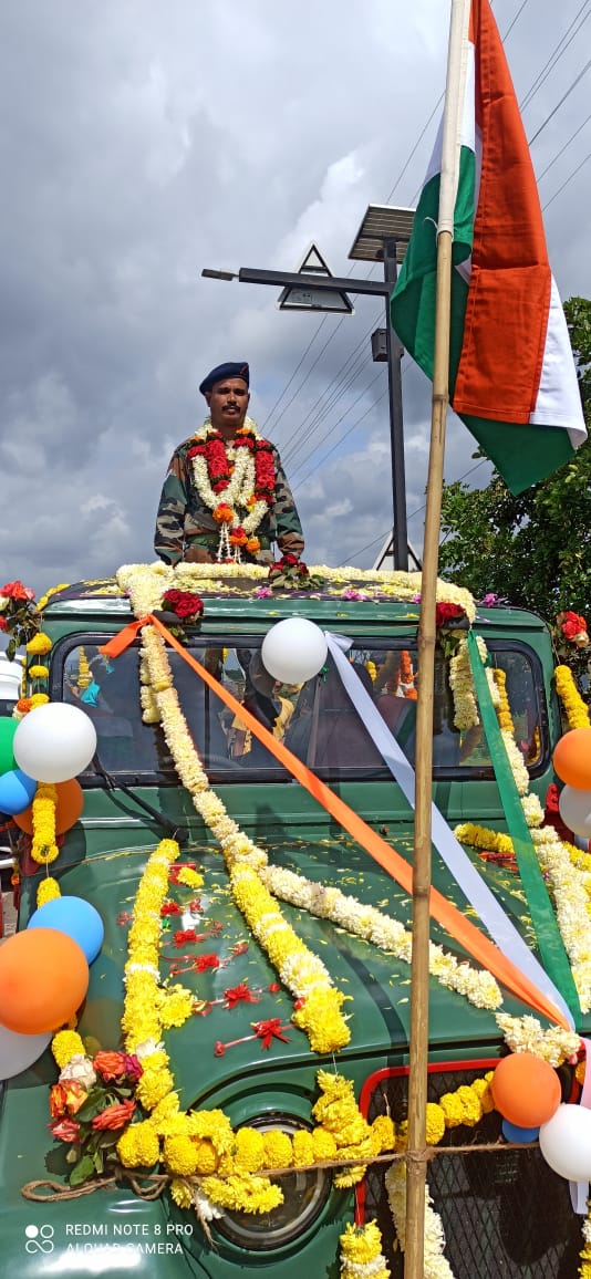 ಬೆಳಗಾವಿ: ಭಾರತೀಯ ಸೇನೆಯಲ್ಲಿ 18 ವರ್ಷಗಳ ಕಾಲ ದೇಶ ಸೇವೆಯನ್ನ ಮಾಡಿ, ತವರಿಗೆ ಬಂದ ಯೋಧನಿಗೆ ಅಭೂತಪೂರ್ವ ಬೆಂಬಲ ಸ್ವಾಗತವನ್ನ ಸವದತ್ತಿ ತಾಲೂಕಿನ ಸಿಂಗಾರಕೊಪ್ಪ ಗ್ರಾಮದಲ್ಲಿ ಕೋರಲಾಯಿತು.