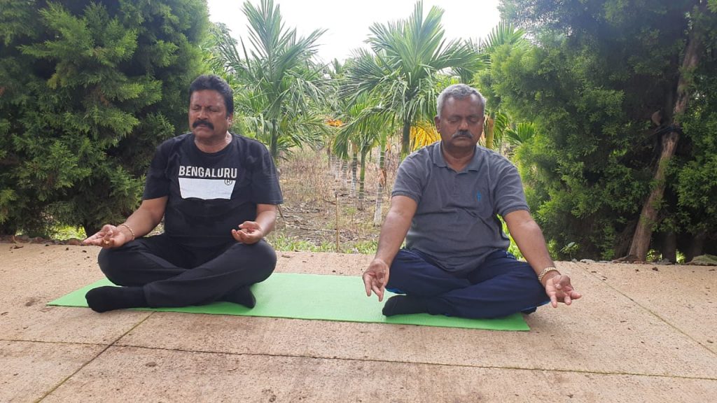 ಸ್ವಗ್ರಾಮ ಯಲವಾಳ ತೋಟದಲ್ಲಿ ಯೋಗ ಮಾಡಿದ ಕೃಷಿ ಸಚಿವ: ಸಾಥ್ ನೀಡಿದ ಇನ್ನೋಬ್ಬ ಸಚಿವ