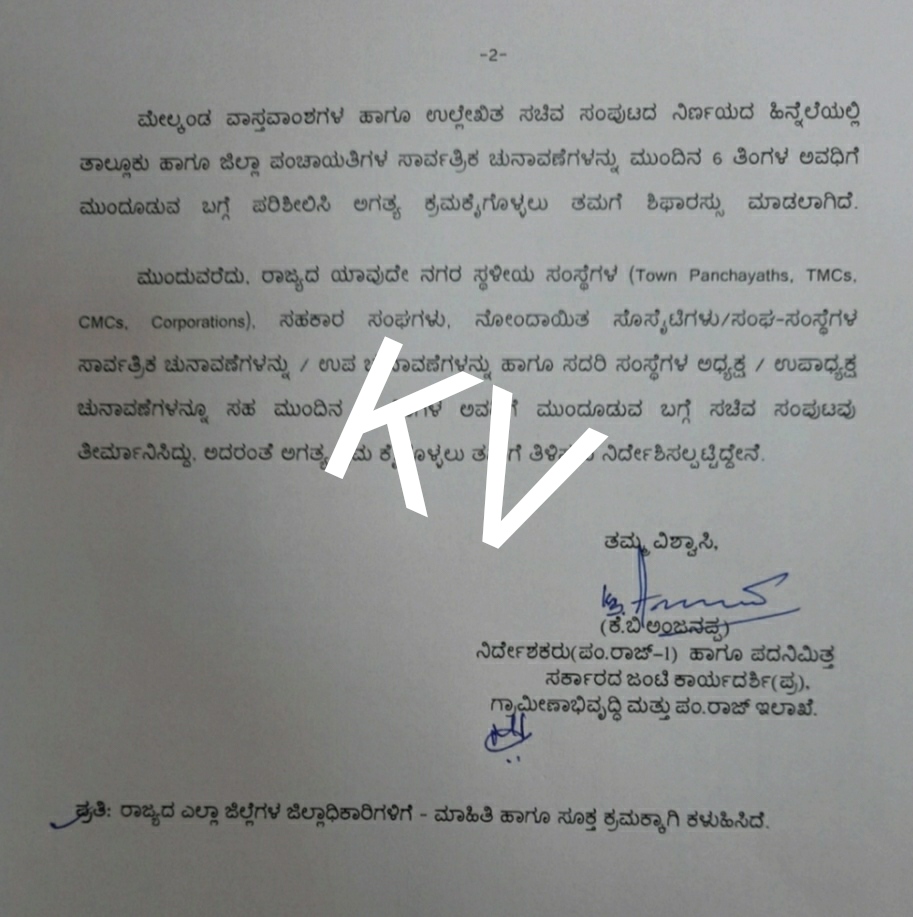 ತಾಲೂಕು ಹಾಗೂ ಜಿಲ್ಲಾ ಪಂಚಾಯತಿ ಚುನಾವಣೆಗಳನ್ನ ಆರು ತಿಂಗಳ ಅವಧಿಗೆ ಮುಂದೂಡುವ ಬಗ್ಗೆ ಪರಿಶೀಲಿಸಿ, ಅಗತ್ಯ ಕ್ರಮವನ್ನ ಜರುಗಿಸುವಂತೆ ಕೋರಲಾಗಿದೆ.